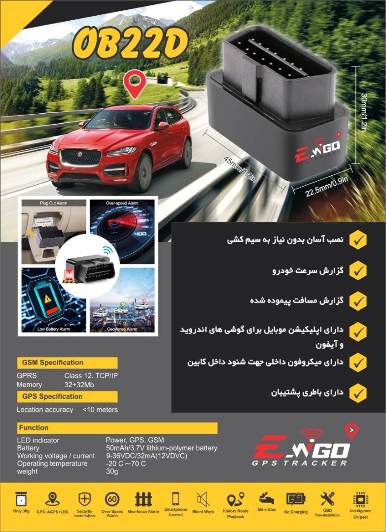 ردیاب خودرو مدل OB22D قابل نصب بر روی انواع خودروهای سبک می باشد. این ردیاب بدون نیاز به سیم کشی قابلیت اتصال به دیاگ با پورت OBD را دارد. این ردیاب ابعاد کوچک و بهینه ای دارد، توسط این ردیاب می توانید صداهای داخل کابین خودرو را بشنوید. با استفاده از این ردیاب می توانید لحظه به لحظه از مسیر خودرو به صورت آنلاین مطلع شوید. همچنین در صورت سرقت خودرو می توانید مکان خودرو را ردیابی کنید.