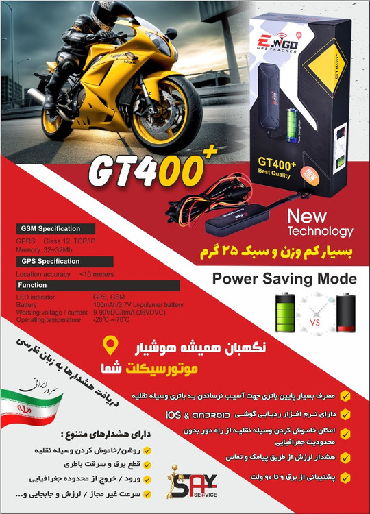 ردیاب مدل +GT400 قابل نصب بر روی انواع وسایل نقلیه ( موتور سیکلت، سواری سبک و سنگین ) می باشد. این ردیاب ابعاد کوچک و مناسبی دارد و قابل نصب در مکان های غیرقابل دسترس است. توسط این ردیاب شما می توانید وسیله نقلیه خود را به صورت آنلاین در هر کجای دنیا که باشید رصد کنید و از موقعیت آن مطلع باشید. همچنین تمامی مسیرهای طی شده و اطلاعات ذخیره شده در ماه های گذشته را با جزییات کامل در اختیار شما می گذارد.